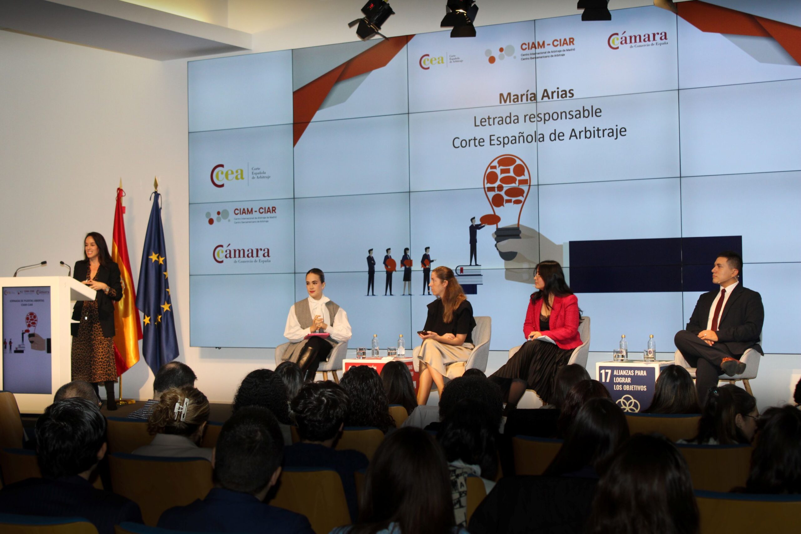La sesión ha sido inaugurada por María Arias, letrada responsable de la Corte Española de Arbitraje (CEA), institución fundadora de CIIAM, que ha dado la bienvenida a más de 60 alumnos procedentes de distintos centros educativos, como la Universidad Carlos III de Madrid, la Universidad CEU San Pablo, ICADE, IE University y la Universidad Complutense de Madrid.
