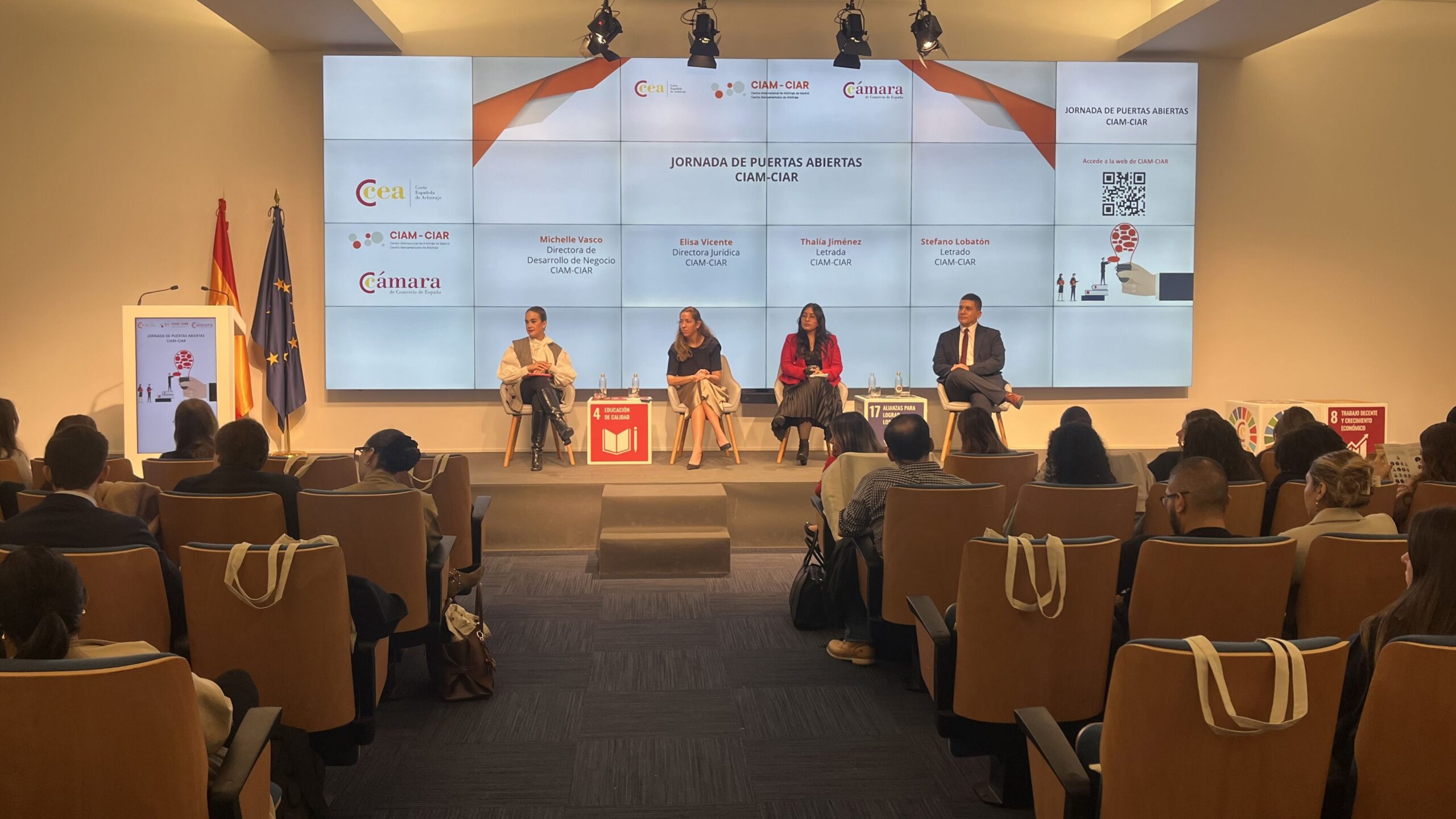 Tras la bienvenida, se ha dado la palabra a los cuatro representantes del Centro: Michelle Vasco, directora de Desarrollo de Negocio; Elisa Vicente, directora jurídica, y Thalía Jiménez y Stefano Lobatón, letrados del CIIAM.