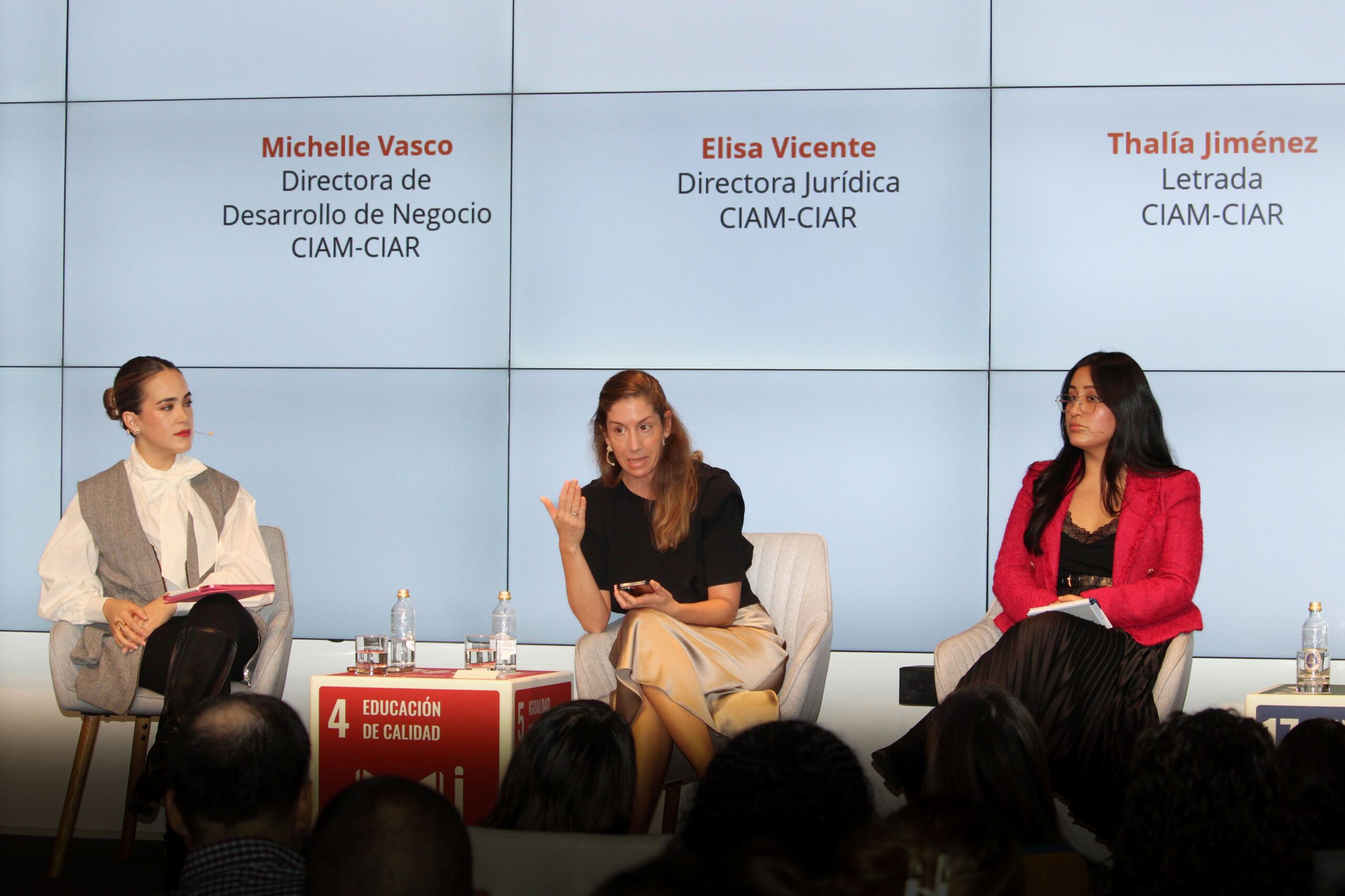 Tras la bienvenida, se ha dado la palabra a los cuatro representantes del Centro: Michelle Vasco, directora de Desarrollo de Negocio; Elisa Vicente, directora jurídica, y Thalía Jiménez y Stefano Lobatón, letrados del CIIAM.