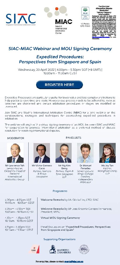 The event will be attended by Víctor Gamero Cabo, Partner at Gamero & Bravo Abogados; Ng Kim Beng, Partner at Rajah & Tann Asia; Manuel Penades, Professor at King’s College London and an independent arbitrator; and Joy Tan, Partner at Wong Partnership LLP. The session will be moderated by Lawrence Teh, Senior partner at Dentons Rodyk.