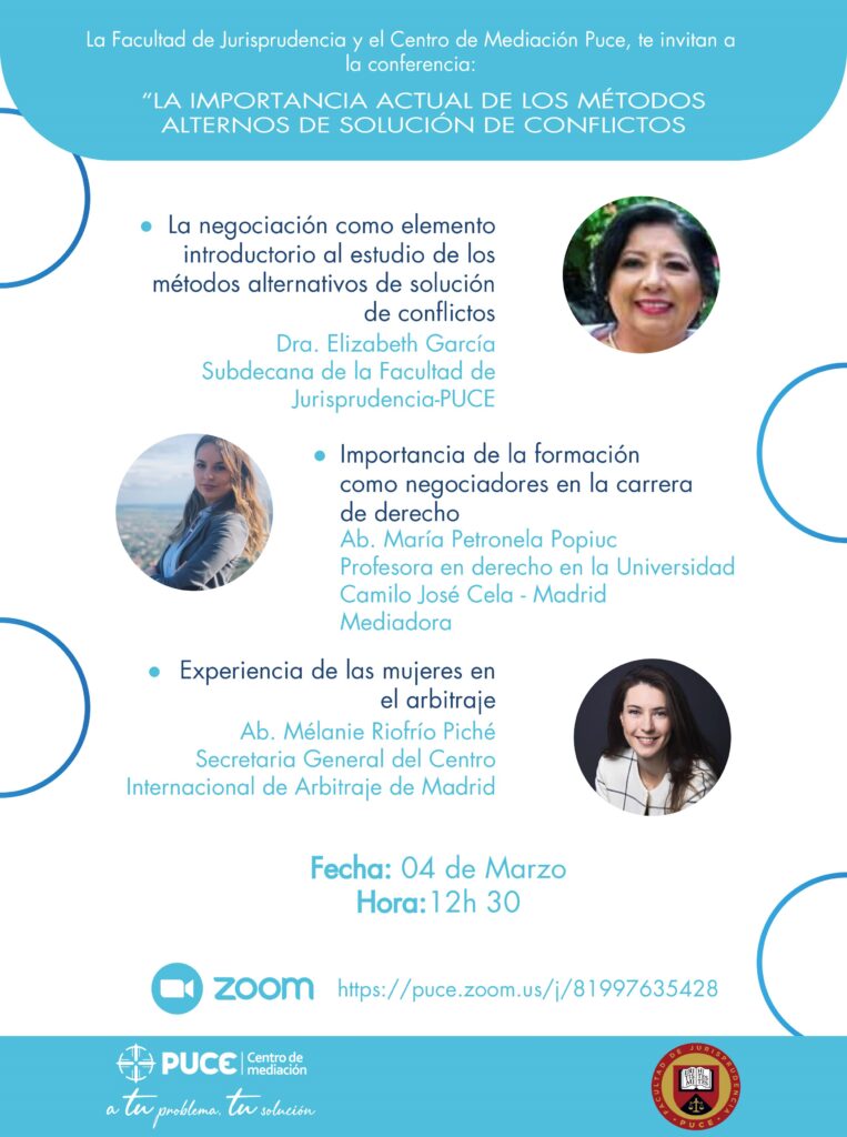 La ponencia se enmarcó dentro de la conferencia «La importancia actual de los métodos alternos de solución de conflictos», organizada por la Facultad de Jurisprudencia y el Centro de Mediación Pontificia Universidad Católica del Ecuador. En ella, también participaron la Dra. Elizabeth García (Subdecana de la Facultad de Jurisprudencia de la PUCE) y la abogada María Petronela Popiuc (Profesora en derecho de la Universidad Camilo José Cela y mediadora).