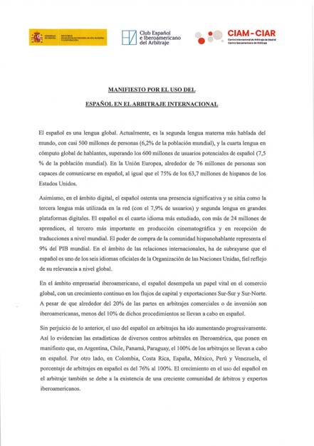 El pasado 8 de noviembre de 2024, el Ministerio de Asuntos Exteriores, Unión Europea y Cooperación, el Club Español e Iberoamericano del Arbitraje y el Centro Internacional de Arbitraje de Madrid – Centro Iberoamericano de Arbitraje, firmaron el Manifiesto por el uso del español en el arbitraje internacional.