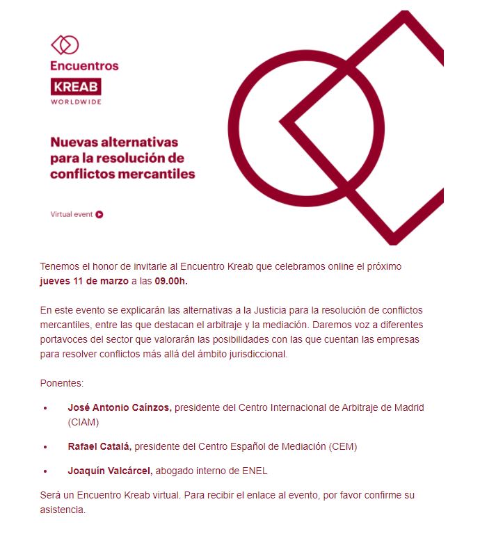 El próximo 11 de marzo se celebrará el #EncuentrosKreab “Nuevas alternativas para la resolución de conflictos mercantiles”, un evento donde se explicarán las alternativas a la Justicia