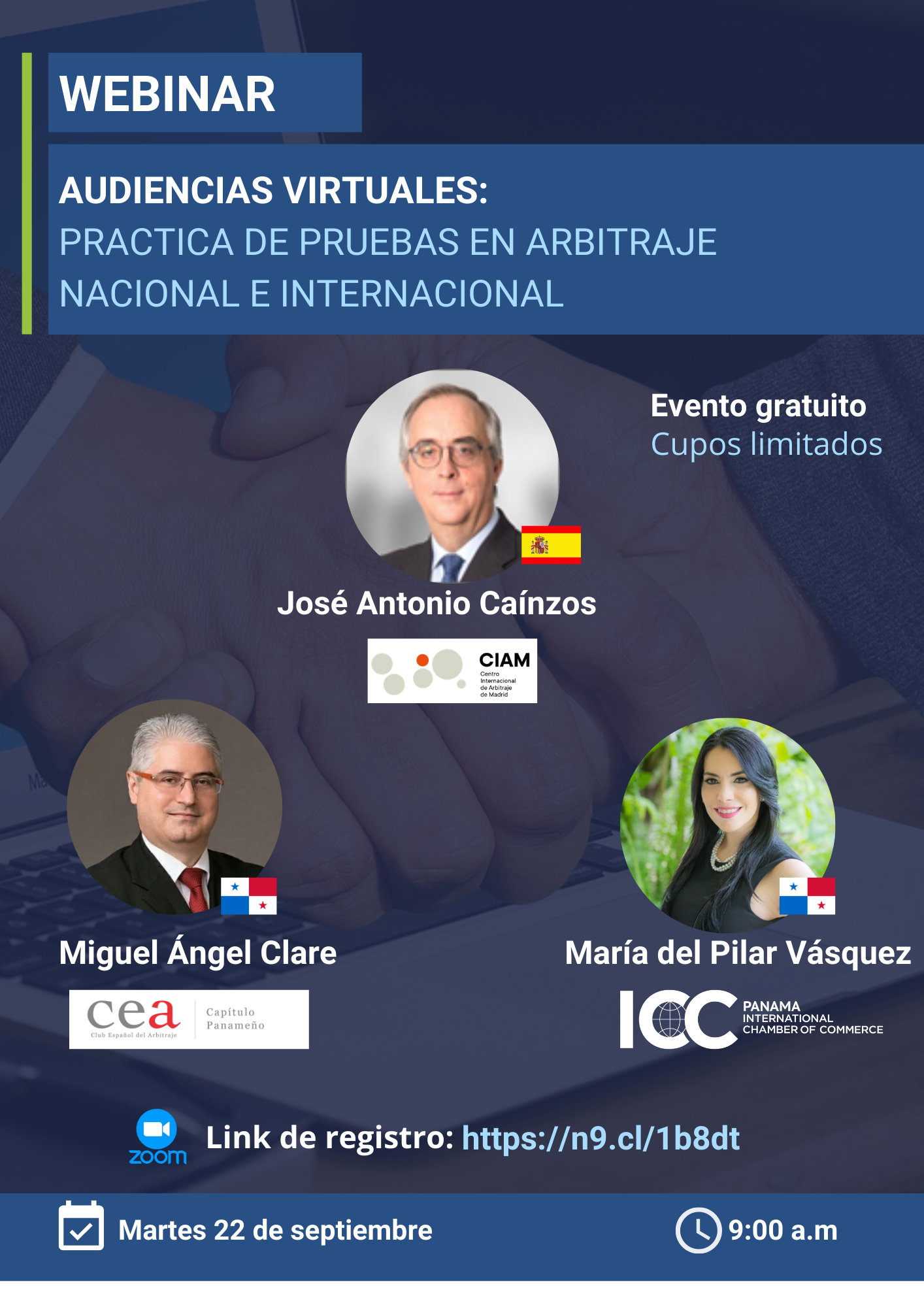 El Capítulo panameño del CEA coorganiza junto a ICC Panamá, el 22 de septiembre de 2020 (09.00h Panamá | 16.00h Madrid), el Webinar titulado «Audiencias virtuales: práctica de pruebas en arbitraje nacional e internacional«.