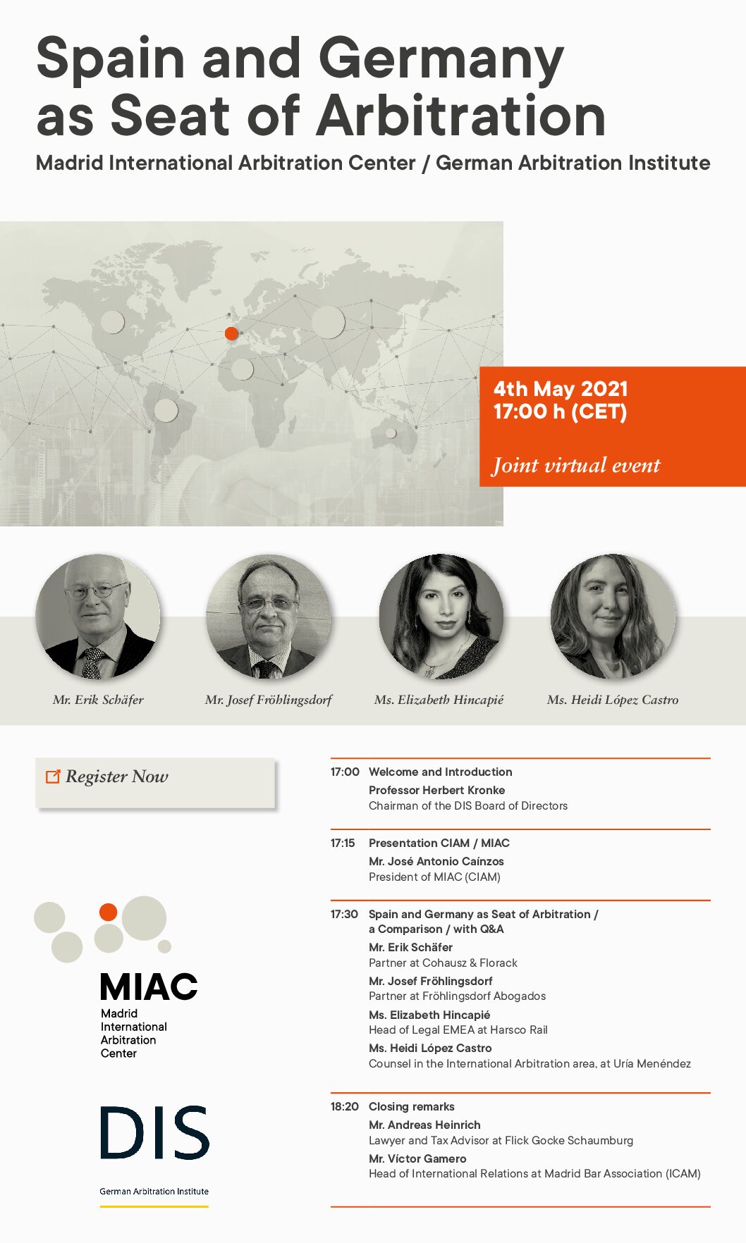 MIAC (CIAM) is proud to co-organize with the Deutsche Institution für Schiedsgerichtsbarkeit e.V. (DIS) German Arbitration Institute the webinar «Spain and Germany as Seat of Arbitration», which will be celebrated on May 4th at 17:00h (CET).
